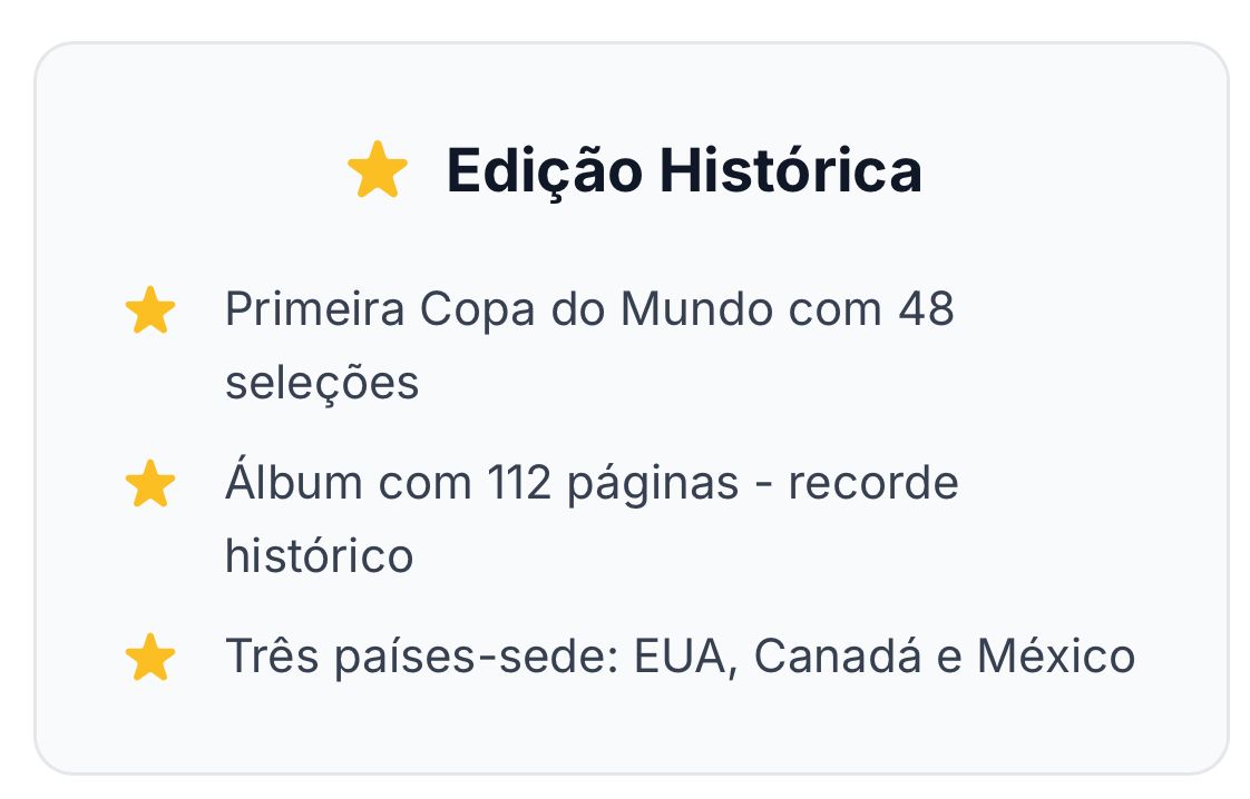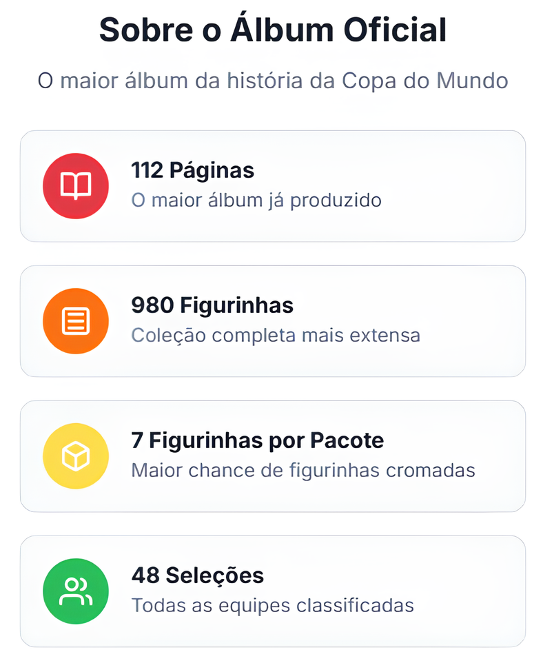 Os pacotes de figurinhas vêm lacrados e são aleatórios, como nas bancas e lojas. Cada pacote contém figurinhas oficiais da coleção da Copa do Mundo 2026.